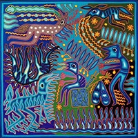 Tamatsi, the Deer God, is a very important figure in the huichol cosmogony. As many others figures he has a double entity: he is the prey hunted by the huicholes during the ritual sacrifices and at the same time he is the guide of the hunters; in this way Tamatsi realizes the ethical ideal of the mara'ekame (the huichol shaman): always being ready to self-sacrifice for his community. There are various Deer Gods; this is the Blue Deer.