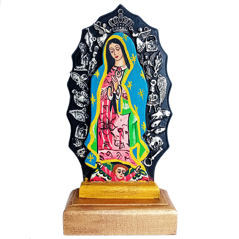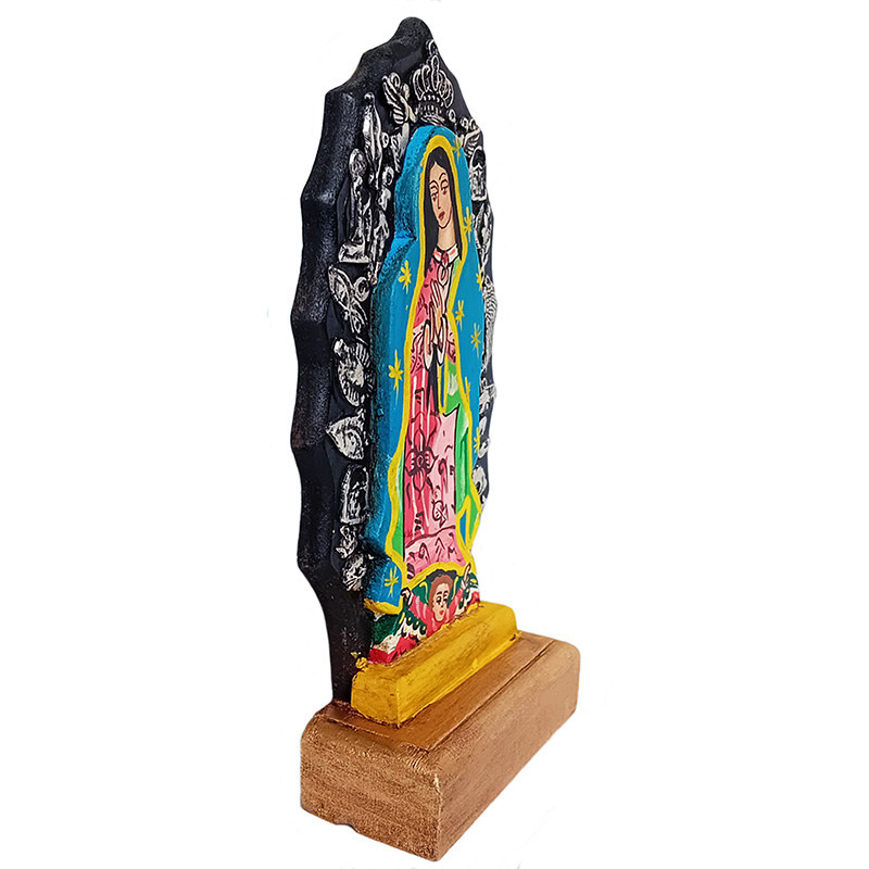 Questa Vergine di Guadalupe viene dallo Stato di Michoacan. E' fatta i legno, intagliata e dipinta a mano, impreziosita da una cornice di milagros in metallo. Può essere collocata sia a parete che su un piano.