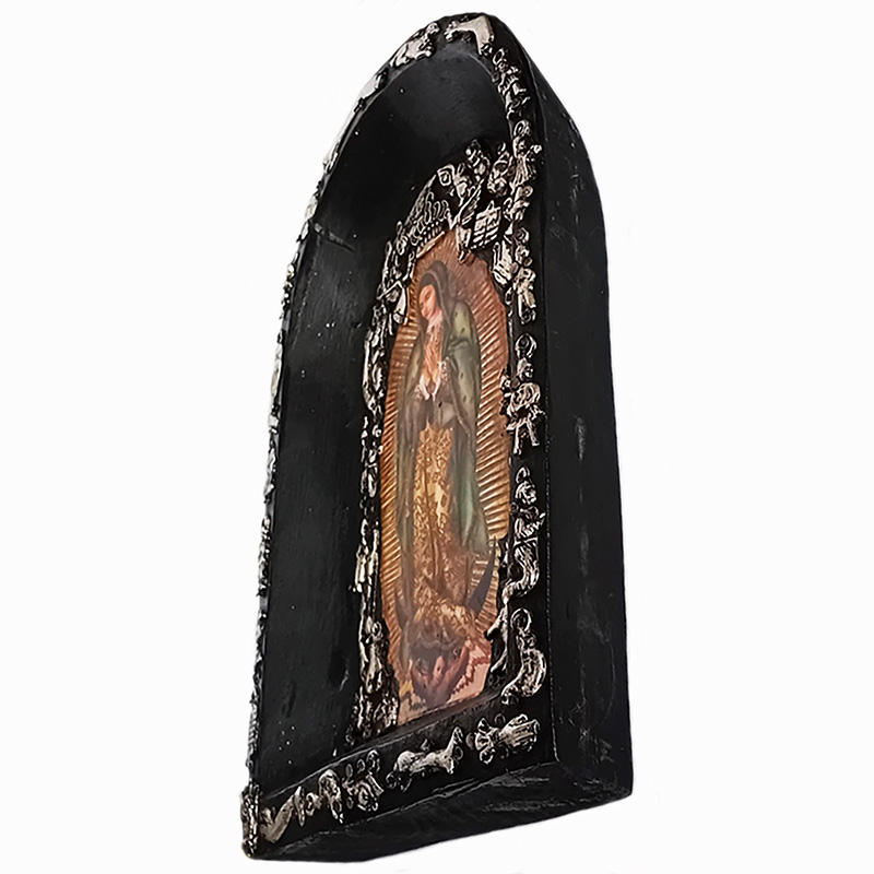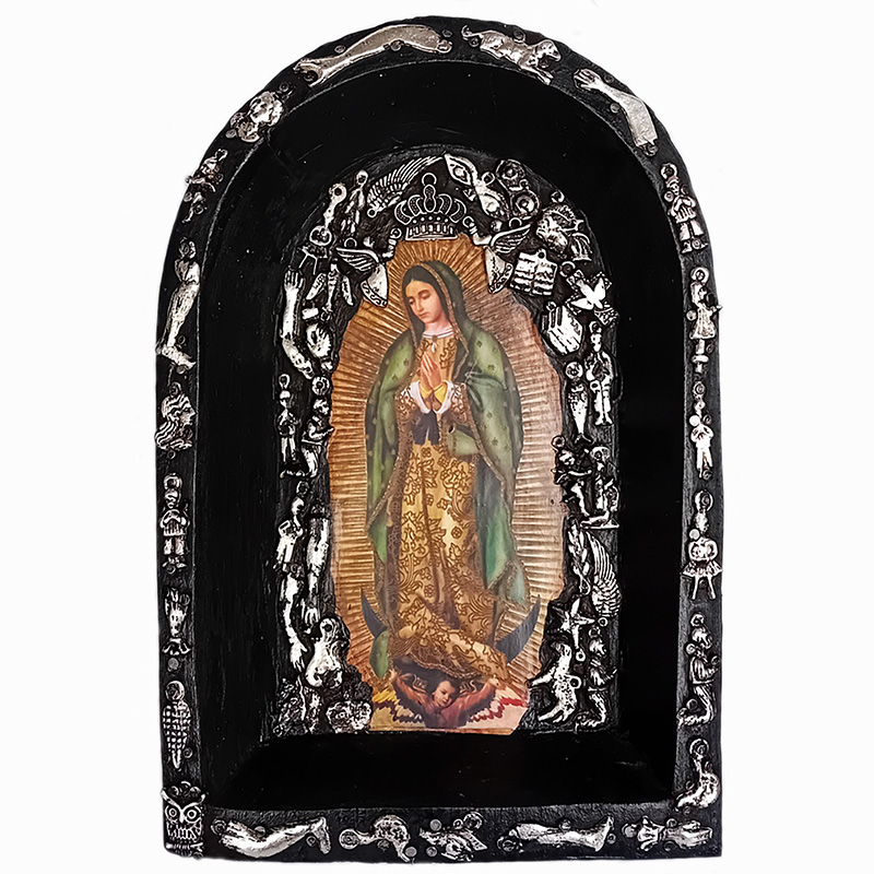 Batea in legno, con doppia cornice di Milagros in metallo. La Vergine di Guadalupe è una stampa. Pronta da appendere (può stare anche in piedi su un piano).