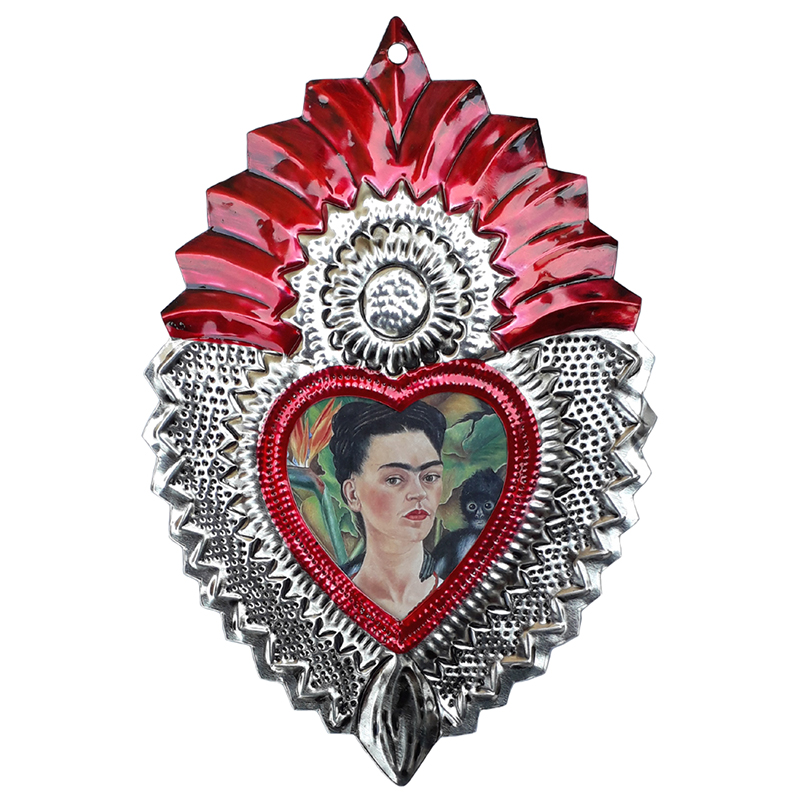 Questo cuore è fatto in "hojalata", la latta di Oaxaca, dipinto a mano. L'immagine di Frida Kahlo è stampata.