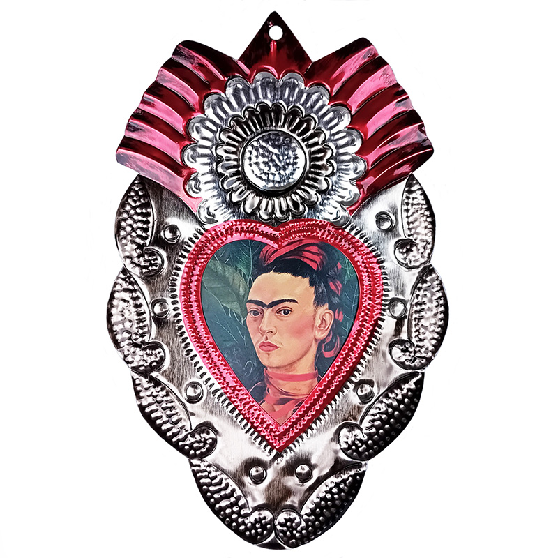 Questo cuore è fatto in "hojalata", la latta di Oaxaca, dipinto a mano. L'immagine di Frida Kahlo è stampata.