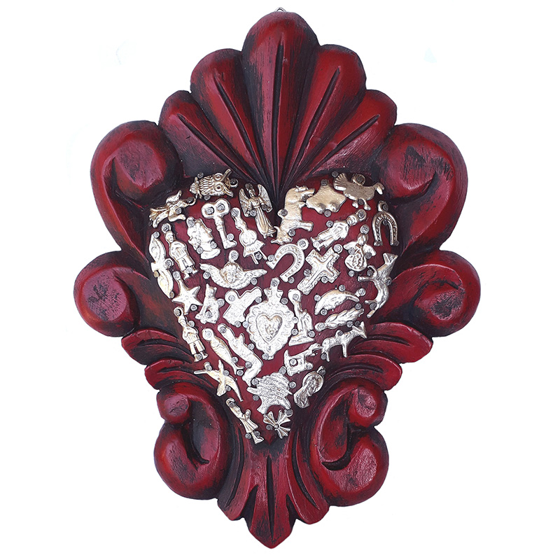 Questo cuore è fatto in legno. I simboli rappresentanti gli ex voto sono in metallo. E' pronto da appendere. Disponibile in due versioni da scegliere nelle "Varianti" qui in basso.