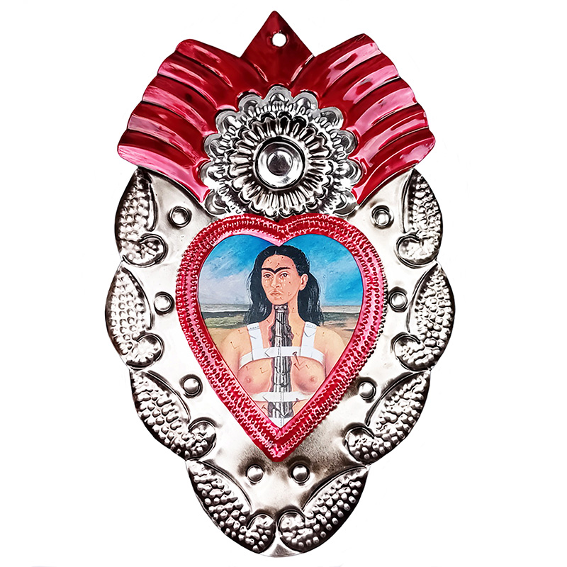 Questo cuore è fatto in latta, tagliato e dipinto a mano. L'immagine di Frida Khalo è una stampa. Pronto da appendere.
