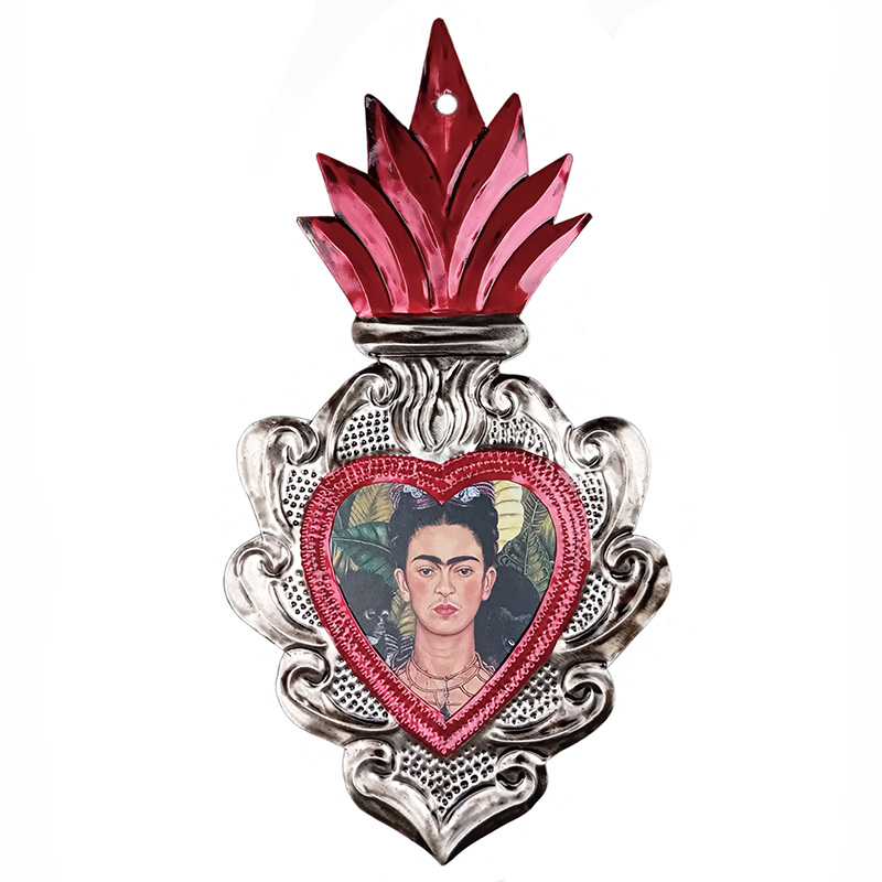 Questo cuore è fatto in latta, tagliato e dipinto a mano. L'immagine di Frida Khalo è una stampa. Pronto da appendere.