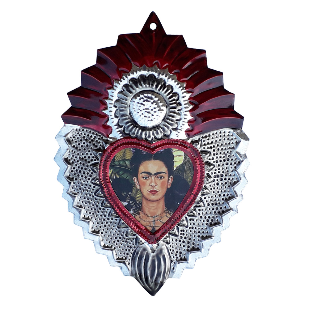 Questo cuore è fatto in latta, tagliato e dipinto a mano. L'immagine di Frida Khalo è una stampa. Pronto da appendere.