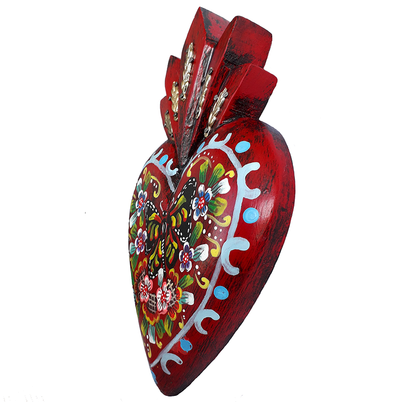 Bellissimo cuore, tagliato e dipinto a mano. Proviene dallo Stato di Michoacan, dove le farfalle monarca concludono il loro percorso migratorio iniziato in Canada.