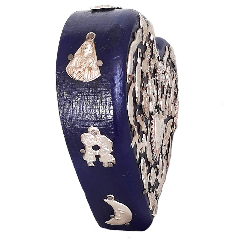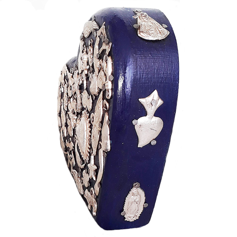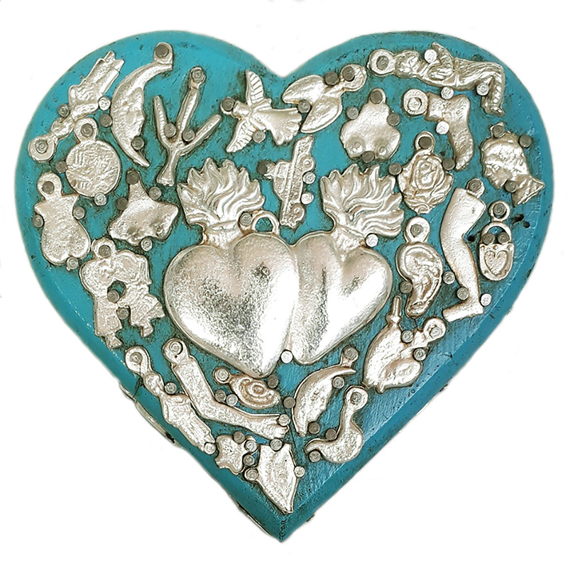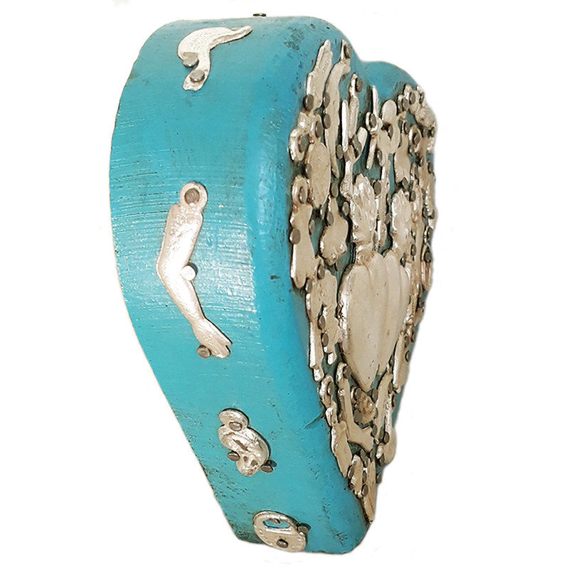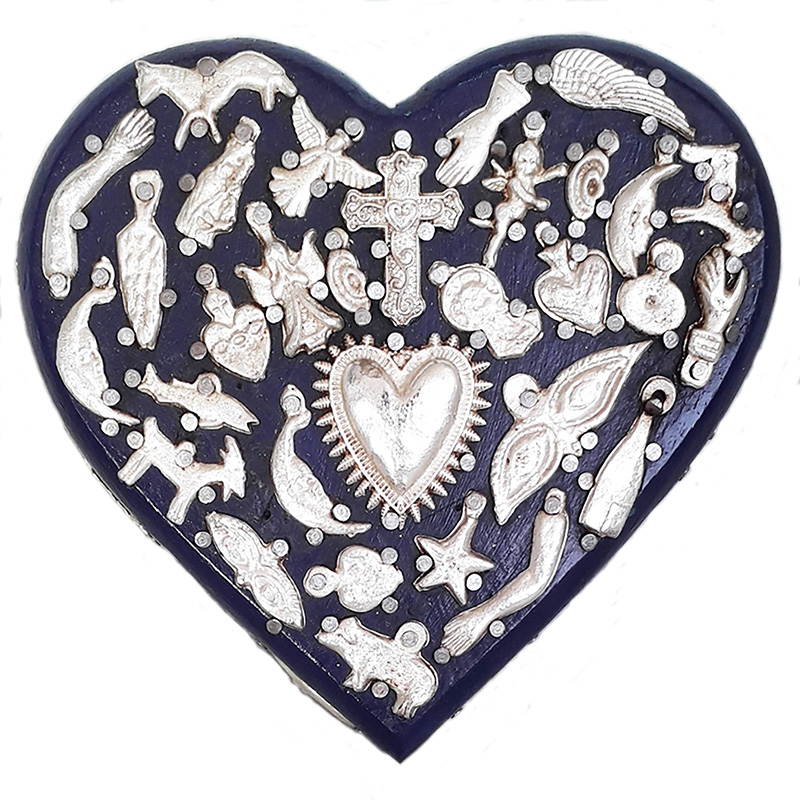 Cuore in legno, intagliato e decorato a mano. I "milagros" sono in metallo, fissati con chiodini. Disponibile in vari colori da scegliere nelle "Varianti" qui in basso