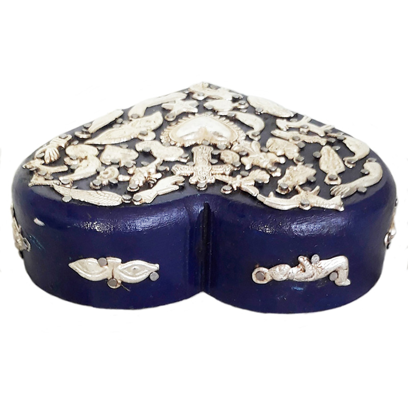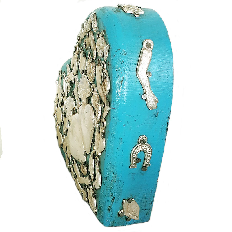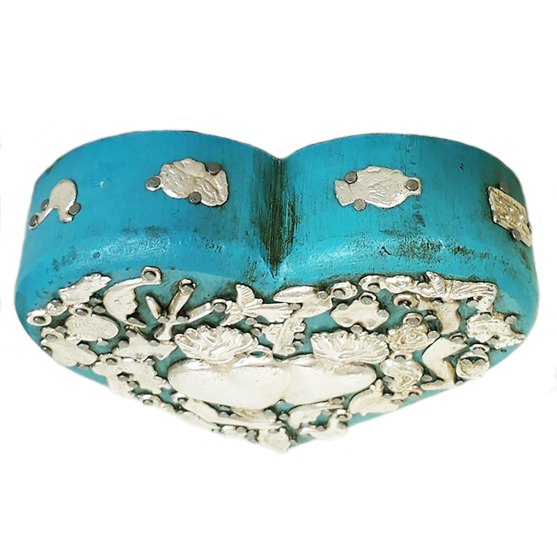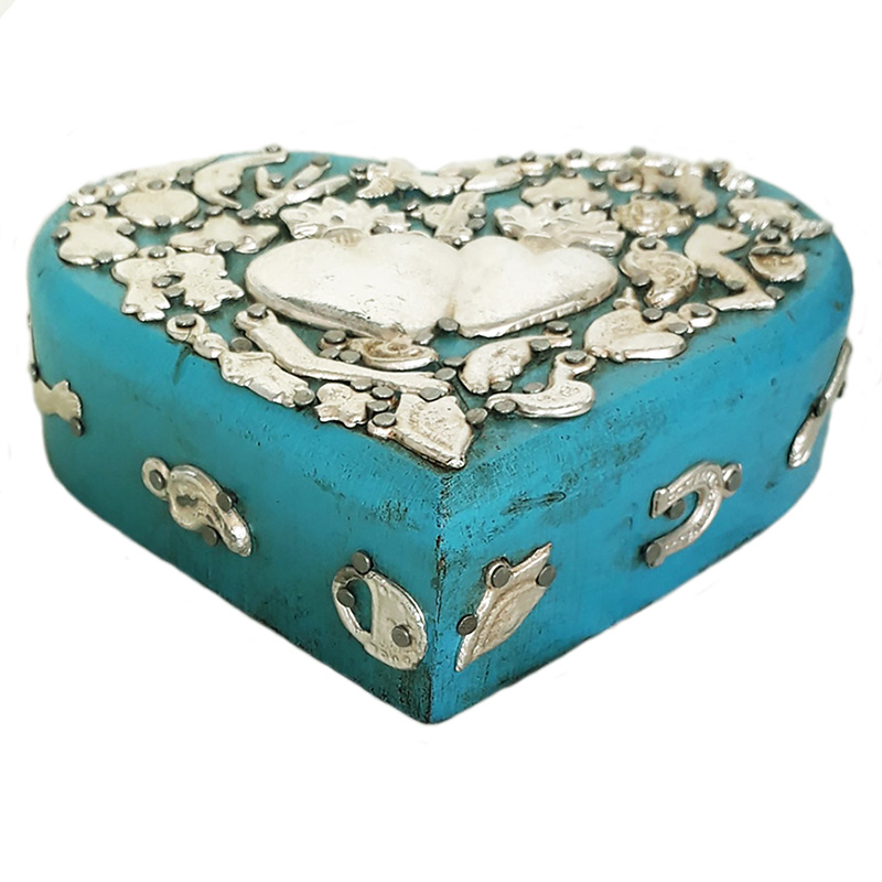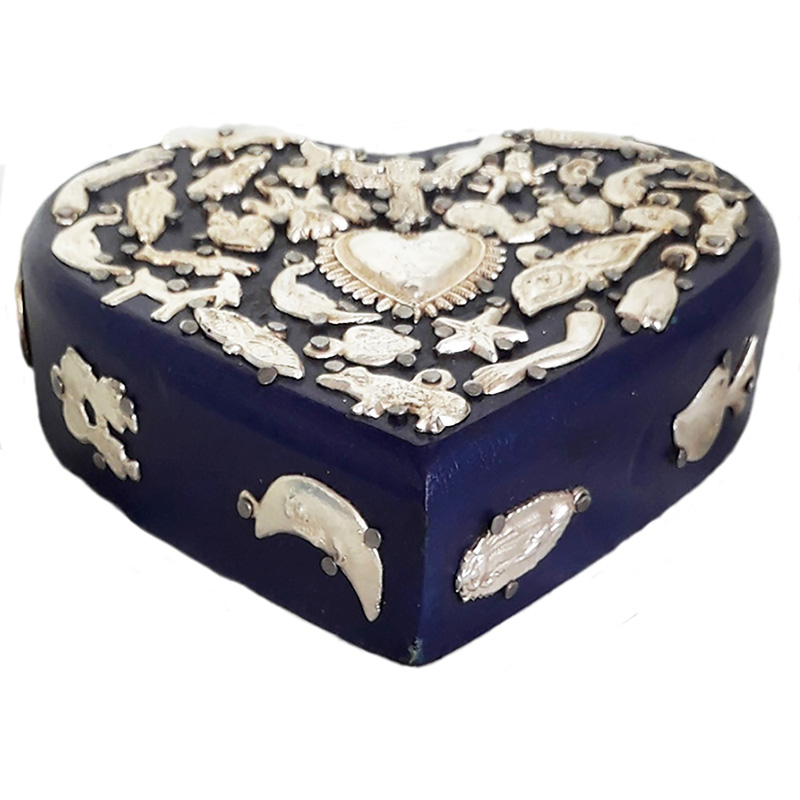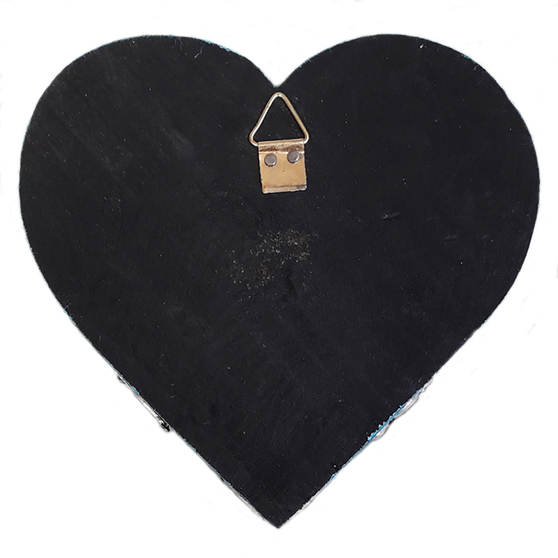 Cuore in legno, intagliato e decorato a mano. I "milagros" sono in metallo, fissati con chiodini. Disponibile in vari colori da scegliere nelle "Varianti" qui in basso