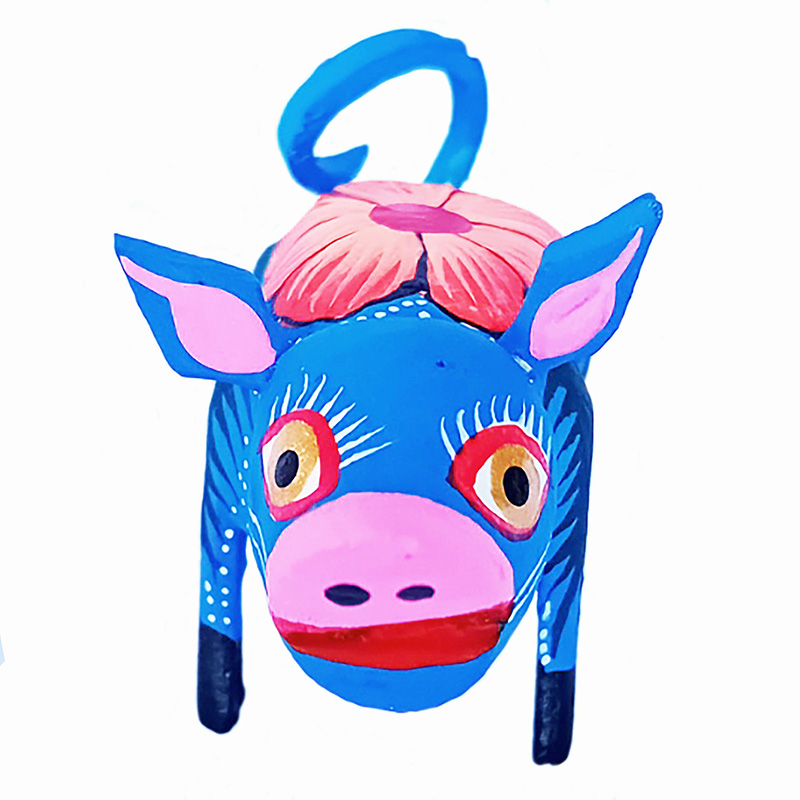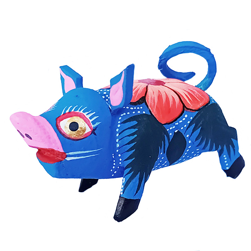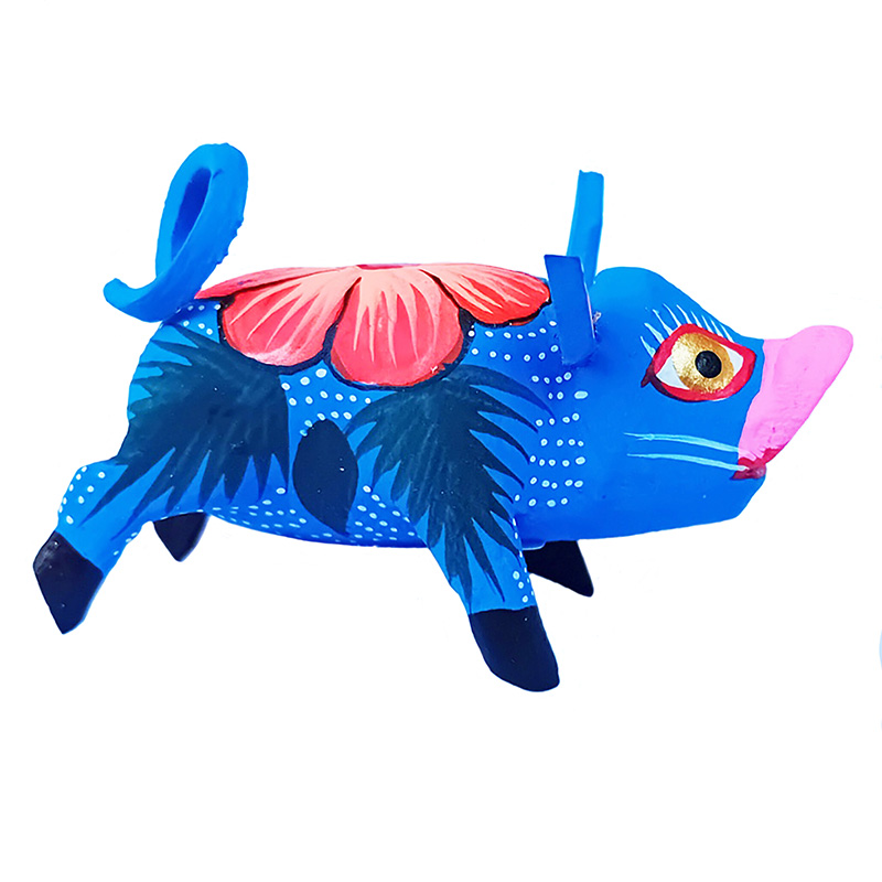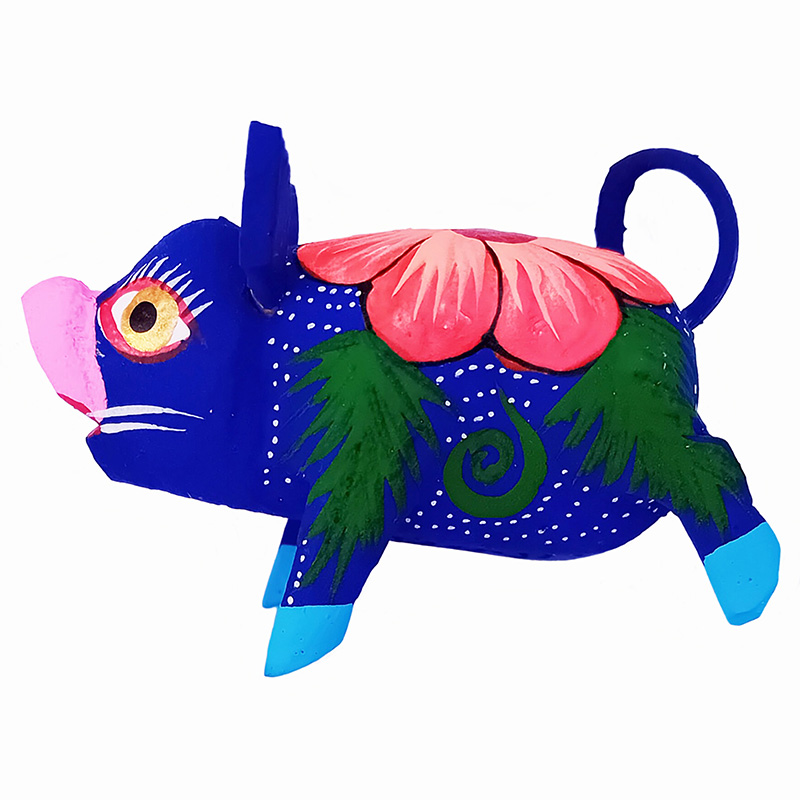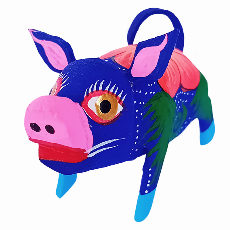 Questo maiale viene dallo Stato di Oaxaca dove si producono i fantastici "alebrijes", animali dalle forme più o meno reali ma decorati in uno stile molto fantasioso e multicolore. E' un prodotto totalmente artigianale e la sua decorazione ne fa un pezzo unico.