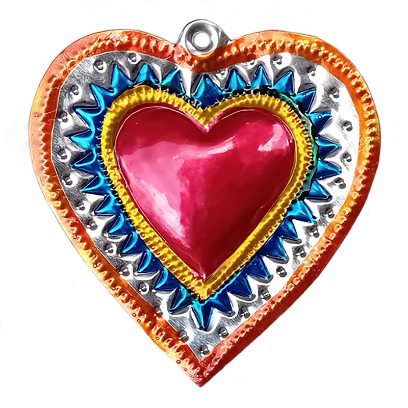 Cuore in latta, tagliato e decorato a mano.