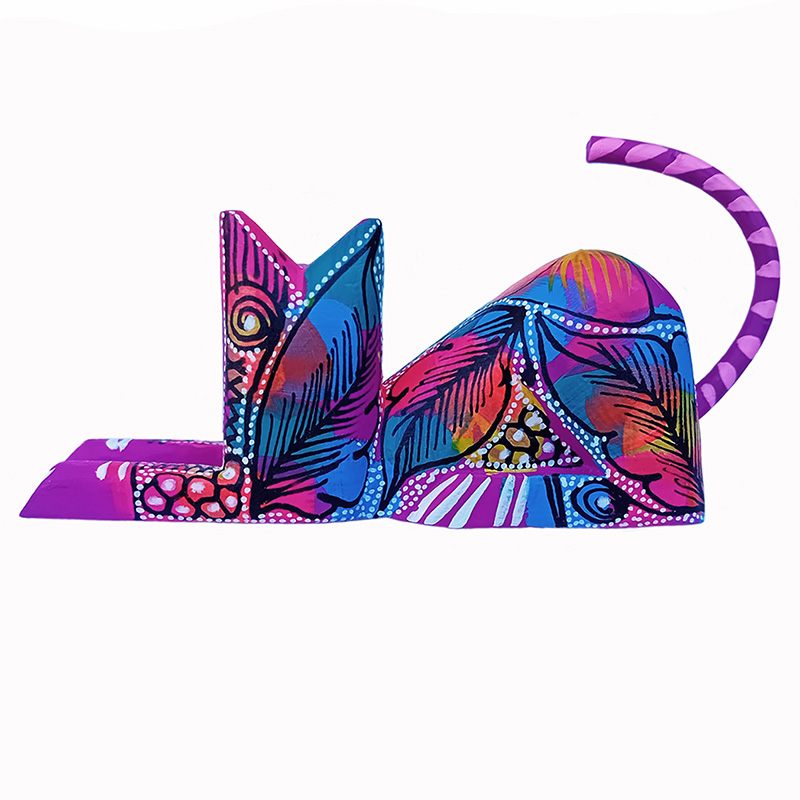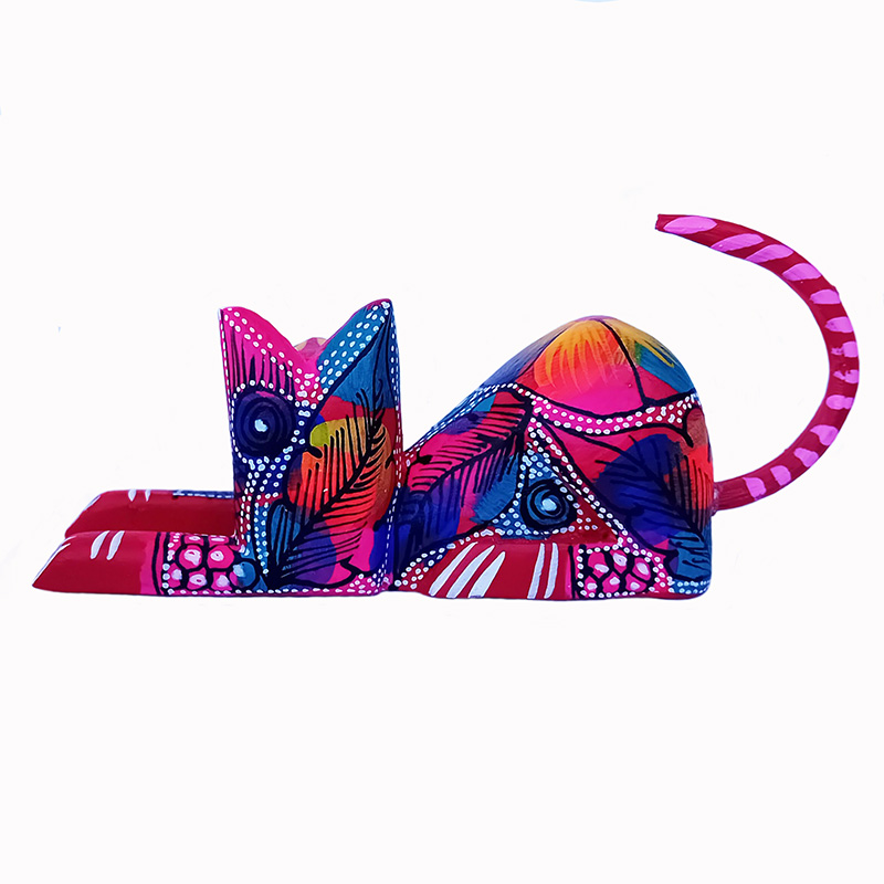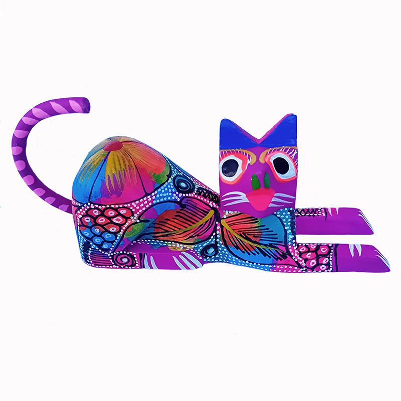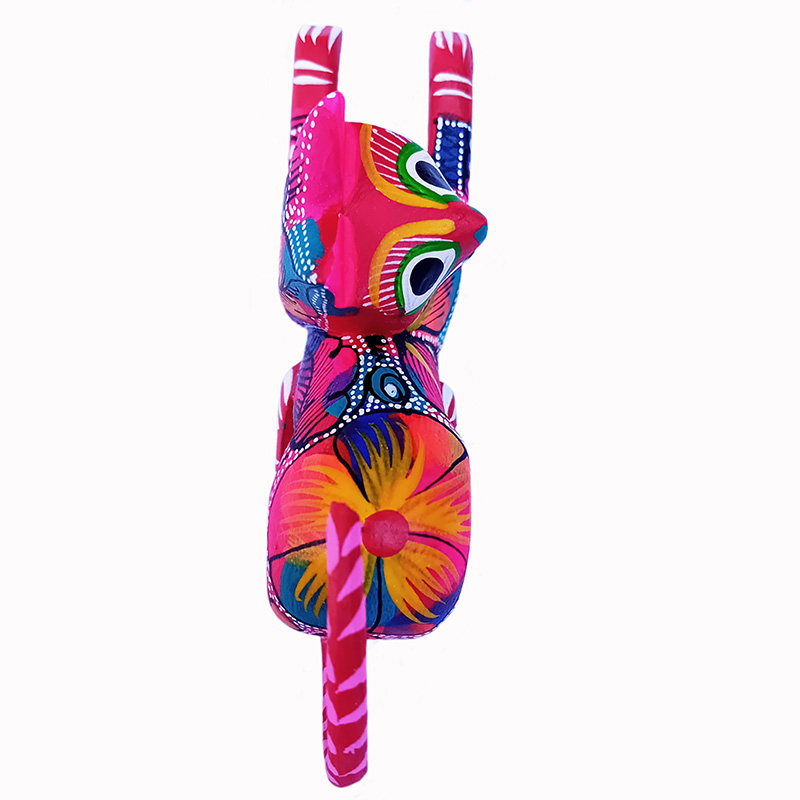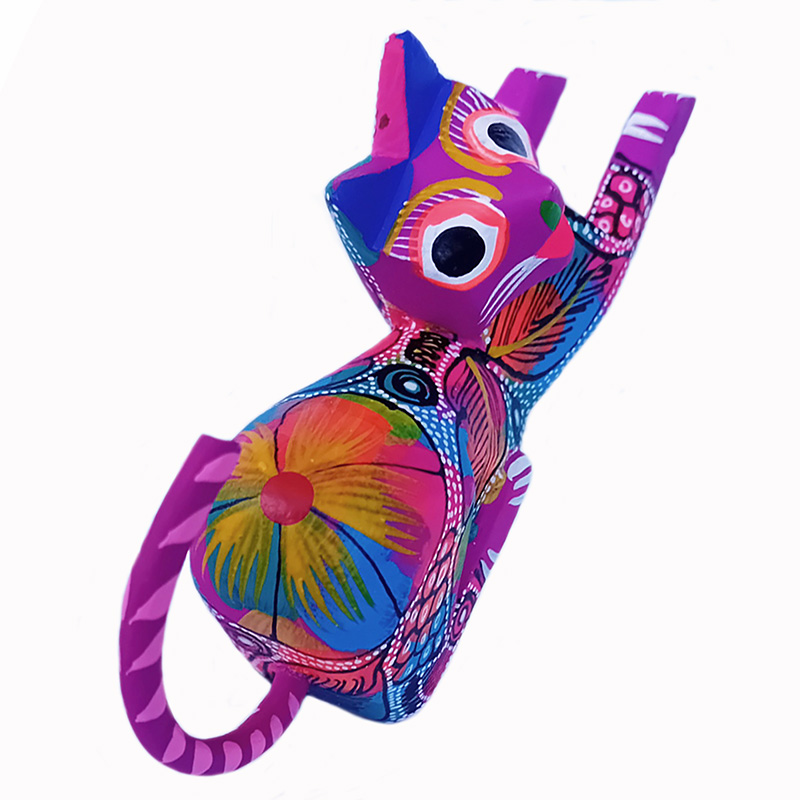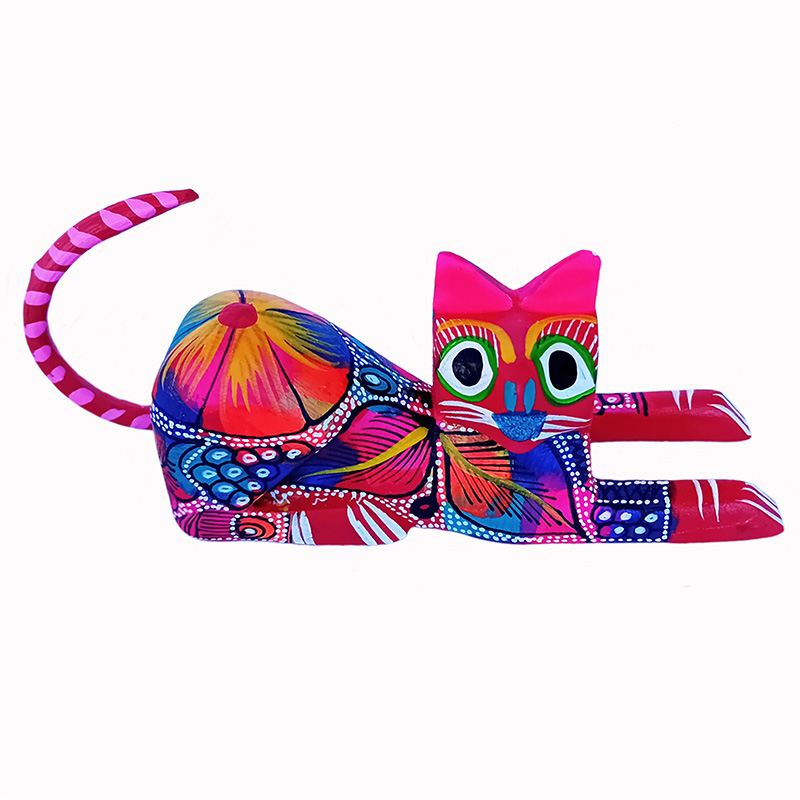 Questo gatto viene dallo Stato di Oaxaca dove si producono i fantastici "alebrijes", animali dalle forme più o meno reali ma decorati in uno stile molto fantasioso e multicolore. E' un prodotto totalmente artigianale e la sua decorazione ne fa un pezzo unico.