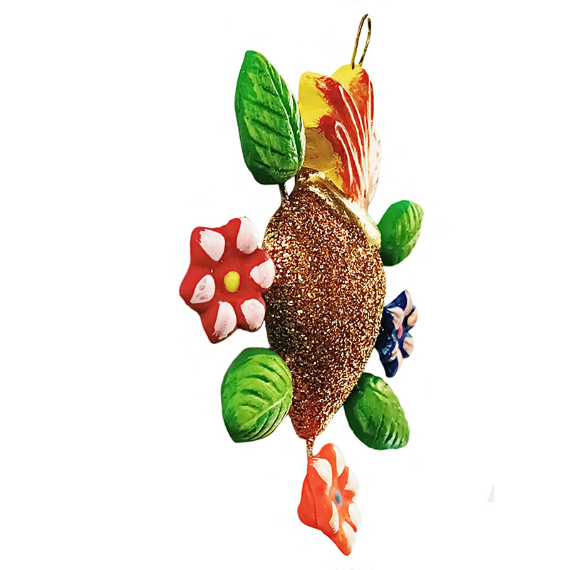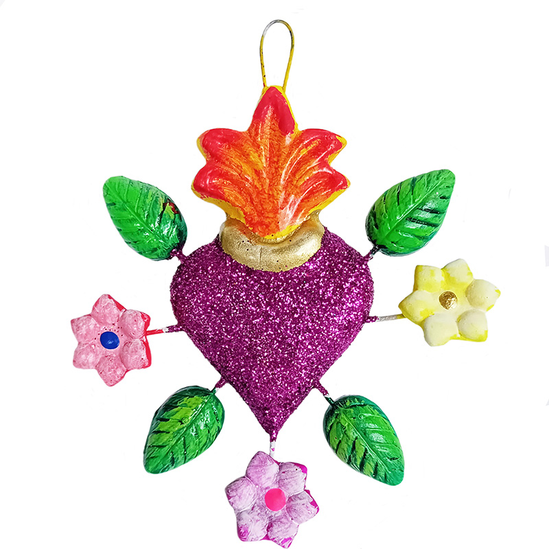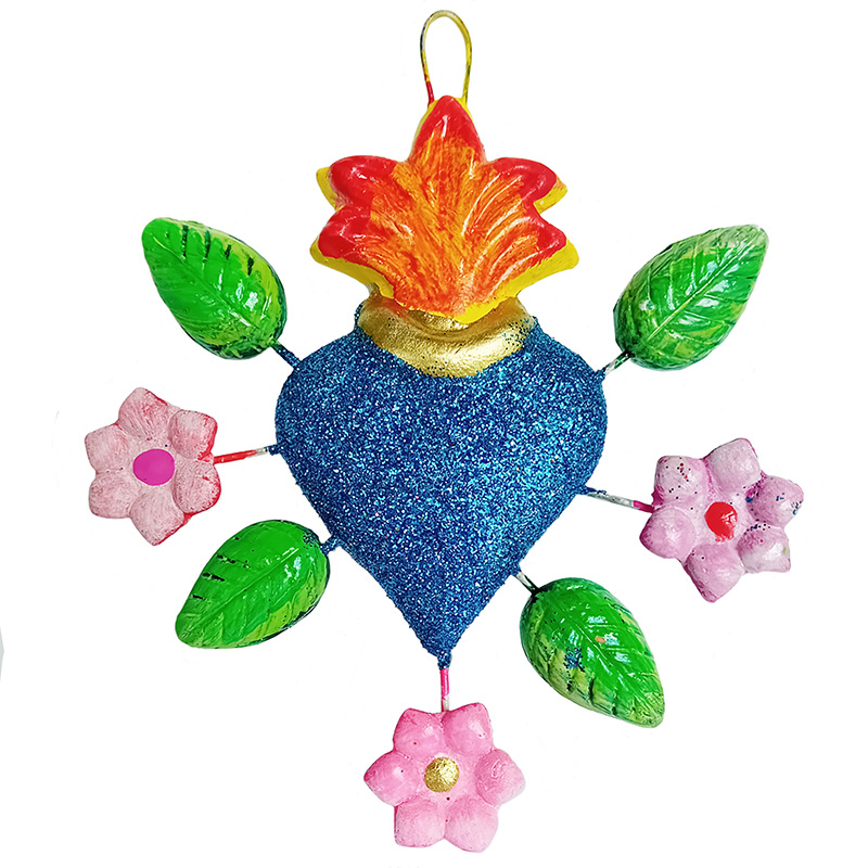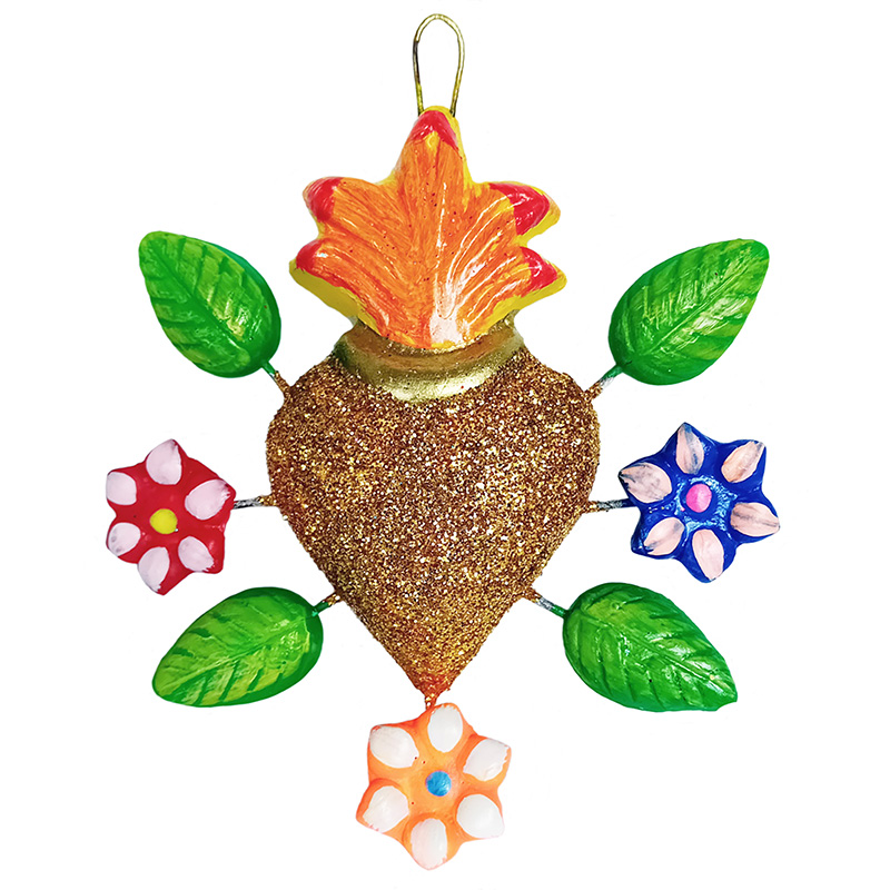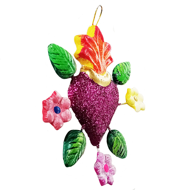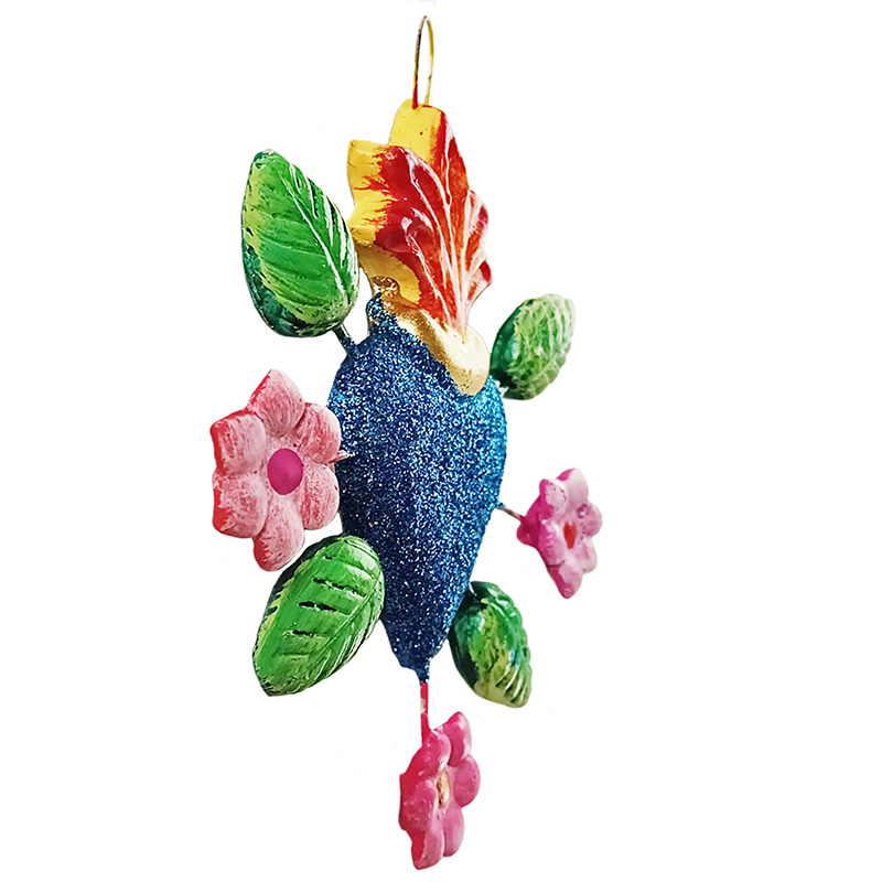 Questi simpatici cuori sacri sono fatti in terracotta e vengono da Oaxaca, Messico. Sono fatti a mano, dipinti con colori acrilici, mentre la parte centrale è ricoperta di porporina. I fiori e le foglie sono fissati al cuore con dei bastoncini metallici. Disponibili in vari colori. Pronti da appendere. Dimensioni: A 13 cm x L 10 cm x P 1 cm